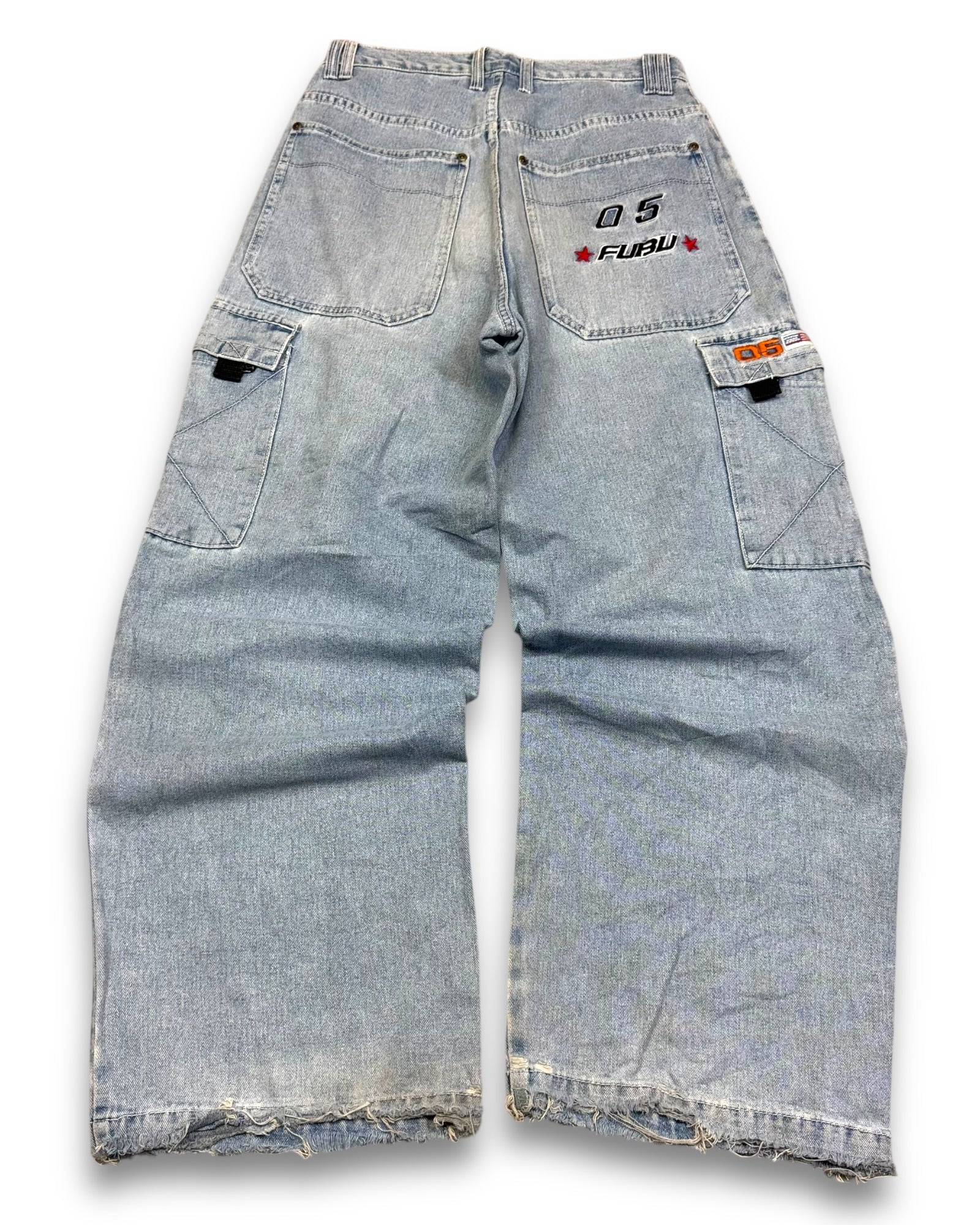 Details: - Rare✨ authentic Y2K/early 2000s FUBU denim with bold “05 FUBU” embroidery and red stars on the back pocket. - Light-wash, heavy 100% cotton jean construction with cargo-style side pockets and branded flap tabs (05 + small flag patch). - Wide-leg/baggy silhouette with raw/frayed hems for a true worn-in streetwear look. - High quality stitching and hardware, classic hip hop era detailing throughout.