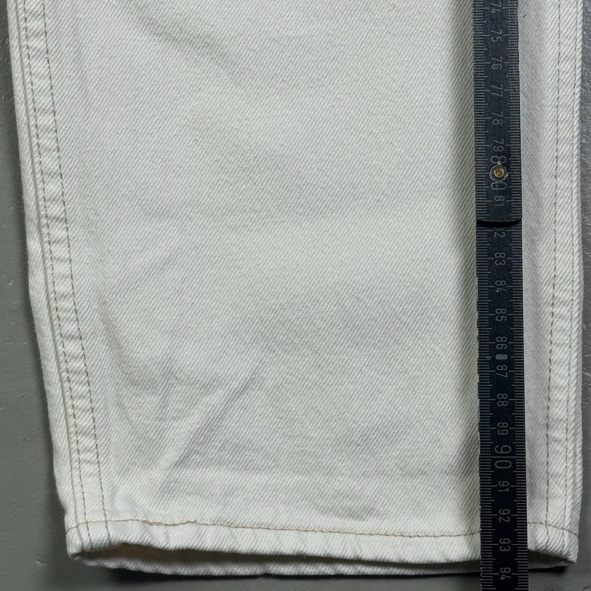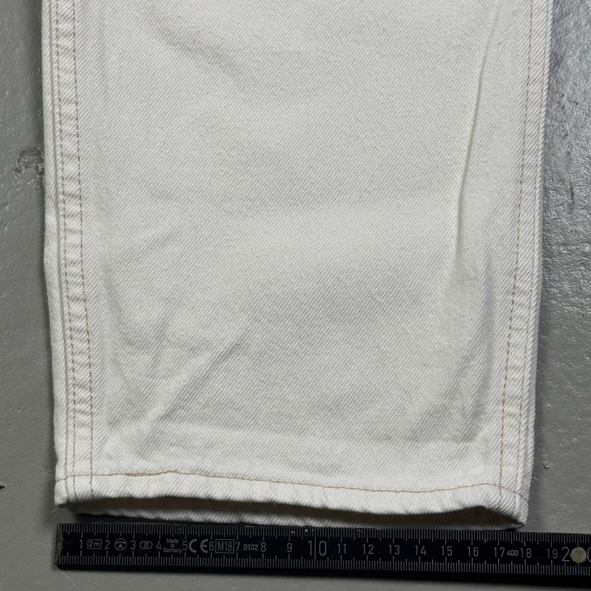 Details: - Rare✨, late 1990’s–early 2000’s workwear carpenter style, heavyweight white denim with durable double-stitched construction. Features utility pockets incl. side hammer loop and carpenter pocket panel, plus classic 5-pocket layout. Clean, minimal look with structured straight leg and crisp contrast stitching.